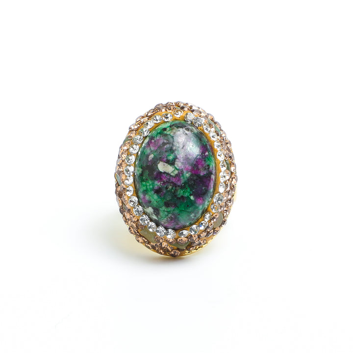 An Asian artist's exploration of chromatic harmony finds sophisticated expression through master artisans' precise craftsmanship, embodying ARTLUMINNA's philosophy of uniting artistic expression with refined aesthetics. This elegant ring features an oval-cut color composition where deep amethyst tones and vibrant emerald hues create a captivating visual dialogue reminiscent of a painter's palette. The color-block arrangement is elegantly framed by a gold-toned metallic framework that enhances the chromatic brilliance while creating a unified artistic statement. Senior artisans employed specialized techniques to achieve perfect color segmentation, ensuring each tone maintains its distinctive character while contributing to the overall harmony. The rich purple tones are traditionally considered to carry creative inspiration, while the lush green hues are believed to promote emotional balance - together symbolizing the beautiful interplay between imagination and harmony. Worn as a statement of artistic sophistication, this ring accompanies creative individuals in embracing life's colorful diversity with graceful discernment and expressive elegance. The exclusive creation carries identification AL-RG-022.