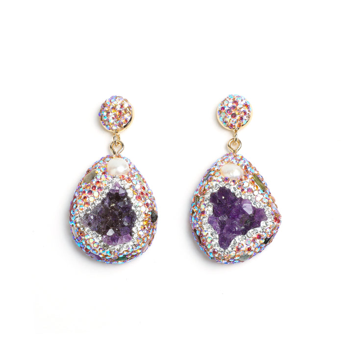 The creative synergy between material and maker is beautifully realized through masterful craftsmanship, embodying ARTLUMINNA’s philosophy of uniting organic textures with luxurious brilliance. These eye-catching earrings present natural amethyst clusters arranged with artistic intention, set against a gold-toned base adorned with iridescent crystals and cultured pearls. Each amethyst’s raw edges and the faceted sparkle of the crystals are meticulously hand-set to create a captivating play of light, while a circular colored crystal accent at the top adds dimensional focus. The mystical allure of amethyst meets the radiant glow of finely cut crystals, achieving a refined balance between natural authenticity and artisanal sophistication. Crafted to honor the unique presence of each stone, these earrings allow the wearer to express individuality and refined taste—a true representation of ARTLUMINNA’s harmonious blend of natural inspiration and contemporary elegance. Handcrafted work, a unique piece, No. AL-ER-019.