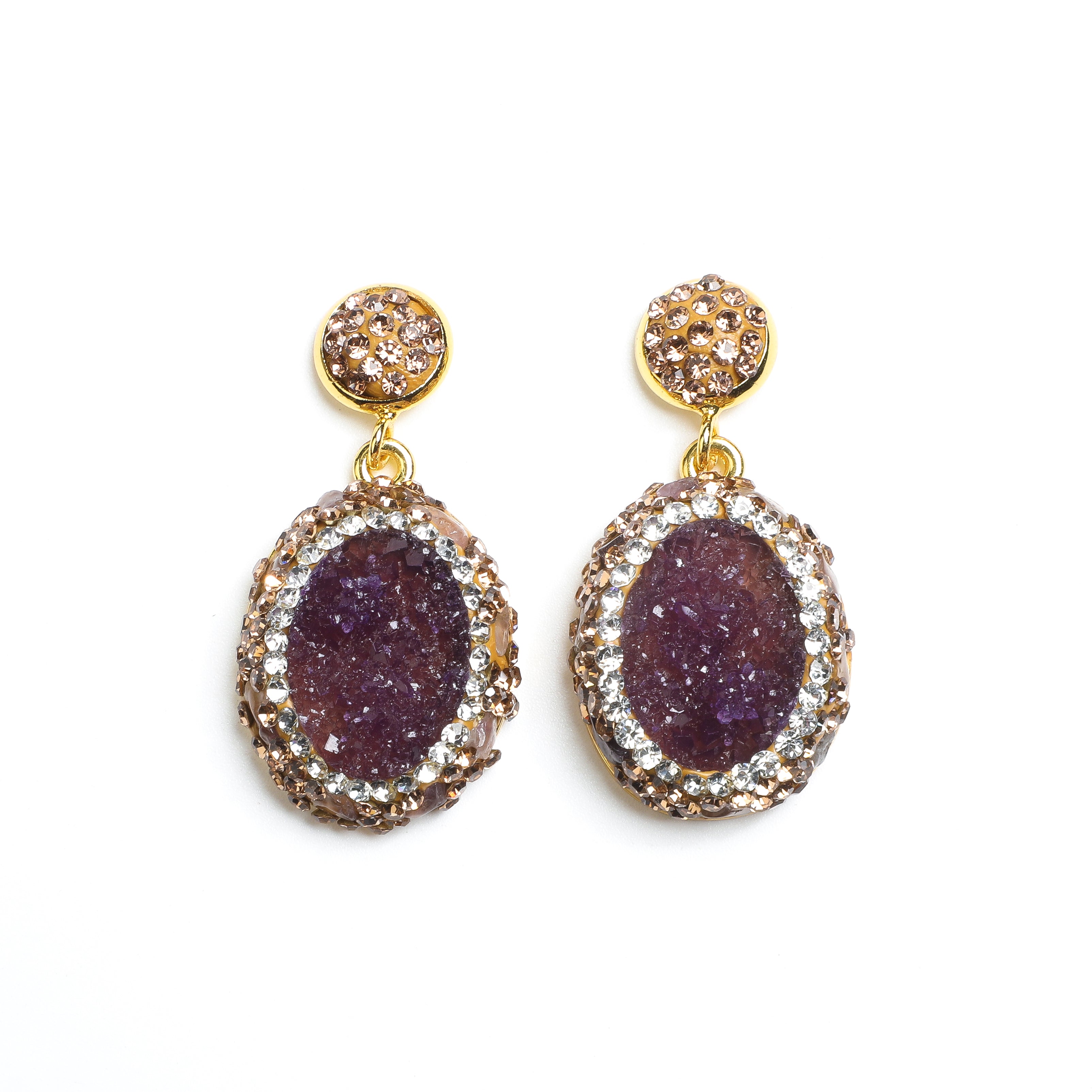 Luxurious harmony between organic form and refined design is skillfully captured through artisanal technique, reflecting ARTLUMINNA’s philosophy of uniting natural amethyst clusters with two-tone crystal brilliance. These enchanting earrings present amethyst clusters arranged in symmetrical composition, set upon a gold base interlaced with gold and cognac-toned crystals. The rich texture of each amethyst and the luminous faceting of the crystals are carefully hand-assembled to deliver a radiant visual experience, enhanced by a circular cognac crystal detail at the top for a refined finish. The deep tone of amethyst merges with the opulent glow of dual-tone crystals, creating an elegant balance between raw beauty and artful execution. Expert craftsmanship ensures both structural elegance and wearing comfort, making these earrings a natural choice for those who appreciate artistry and sophistication—a true expression of ARTLUMINNA’s fusion of mineral inspiration and luxurious design. Handcrafted work, a unique piece, No. AL-ER-022.
