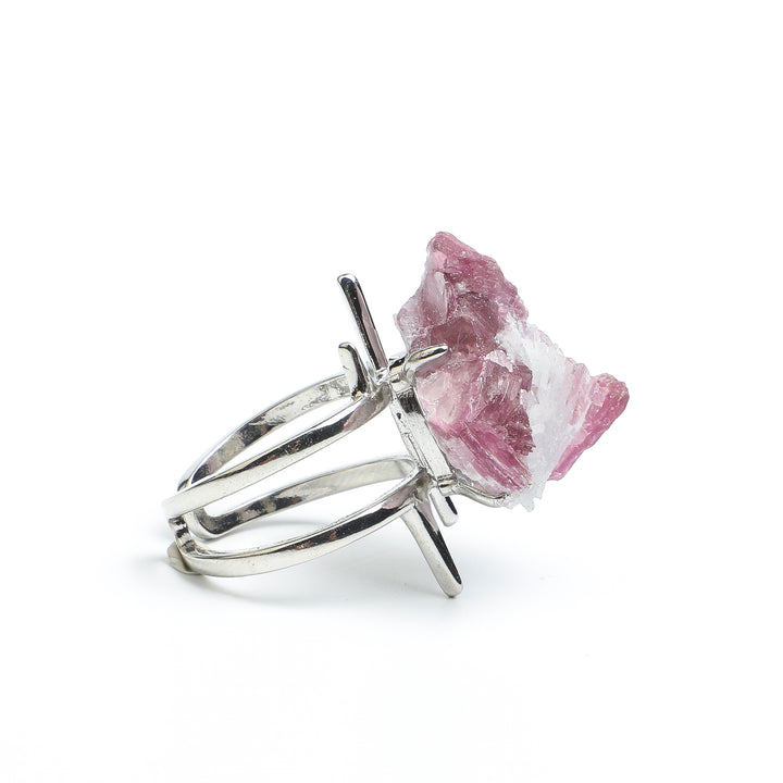 ARTLUMINNA uncovered this pink-and-white crystal cluster from Argentine deposits, where soft pink crystals blend with rugged forms, echoing the wild bloom of tundra flowers. Under light, it radiates a rosy mist and contrasts with edgy silver spikes. Structured with silver spike architecture, the raw tension of the specimen is fully preserved, as if wearing the metamorphic memory of sedimentary rock. After numerous structural revisions, this piece converts geological dynamism into a symbol of breakthrough, empowering the wearer’s pioneering spirit on entrepreneurial journeys.