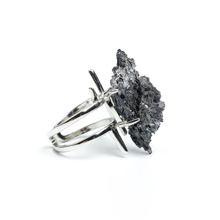 ARTLUMINNA unearthed this iridescent black ore from Australian hydrothermal deposits, where dark gray stone merges with spectral color play. Inside, mineral alterations resemble shattered stardust, emitting a neon-like glow and metallic texture under illumination. Set simply within a polished double silver ring, the rough lava-like texture is fully preserved, allowing the stone to hover like a spark from a subterranean realm. Crafted over weeks, this piece channels the mystery of the depths into a futuristic icon, inspiring multidimensional creativity during artistic endeavors.