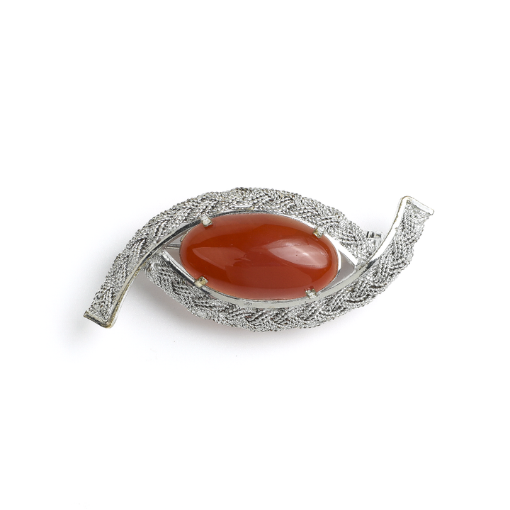 In Eastern tradition, red agate is regarded as a stone of balance, symbolizing both vitality and stability. This brooch accents dark blazers or simple dresses, adding a touch of classical elegance to contemporary style. Each agate's unique banding and the handmade nature of the filigree collectively reflect the aesthetic sensibilities of its era.