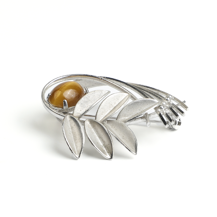 This Showa period vintage brooch beautifully combines natural tiger's eye with satin-finish silver-toned leaves. The tiger's eye exhibits unique chatoyancy with golden-brown hues, featuring captivating light bands that resemble a cat's eye. The leaves are crafted from special alloy with a fine satin finish, showcasing clearly defined leaf veins.