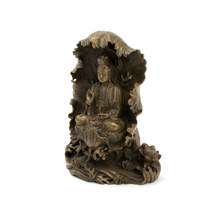 This Japanese vintage copper statue portrays Guanyin Bodhisattva standing on a wave-patterned base. The deity's face radiates serene compassion, with robes flowing gracefully and an ornate leaf-scroll mandorla behind. Cast using traditional methods, the statue has developed a deep brown patina over time, revealing warm copper tones in detailed areas.