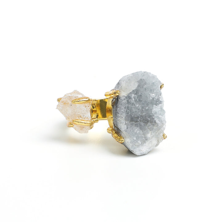 Guided by natural modernism philosophy, ARTLUMINNA selected natural gray calcite and citrine to create this ring. The gray calcite displays delicate stone-like veining, while the citrine accents resemble sunlight touching rock surfaces, showcasing a harmonious dialogue between earthy tones and warm radiance through hand setting techniques.