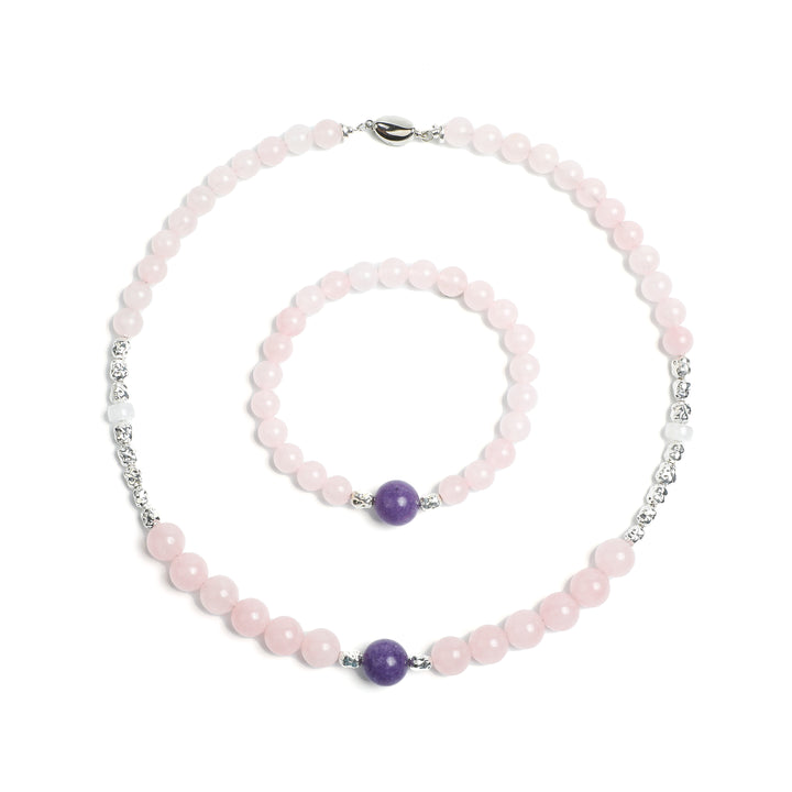 This contemporary jewelry set presents rose quartz beads with a soft, translucent glow, thoughtfully spaced with hand-hammered silver-toned spacers that catch the light with their textured finish. The necklace and bracelet are designed with clean lines and balanced proportions, creating a cohesive look that blends modern aesthetics with organic warmth. Each piece maintains ARTLUMINNA's commitment to thoughtful redesign, where traditional materials find new expression through current design sensibilities.