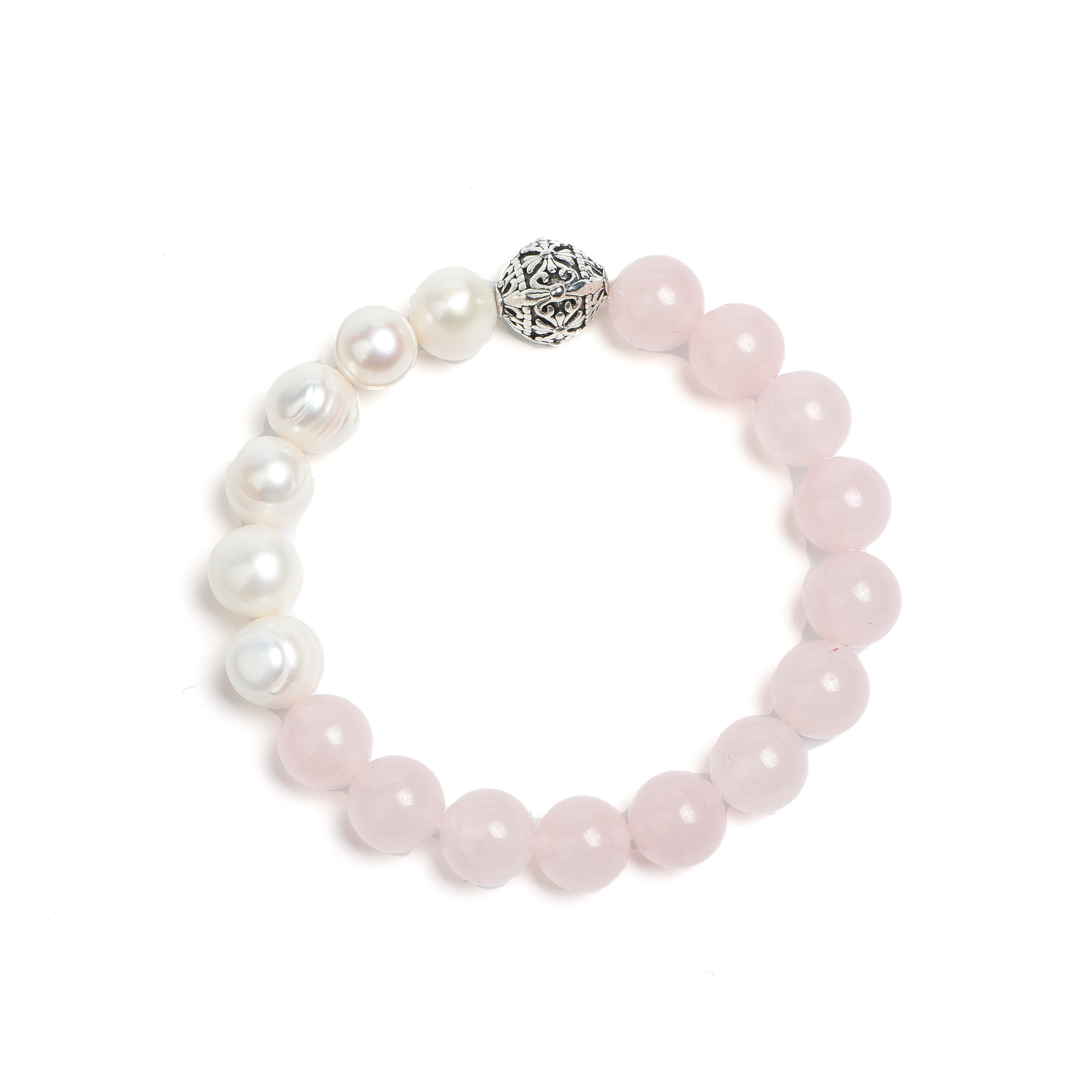 This elegant bracelet showcases carefully selected rose quartz from Madagascar and Chinese freshwater pearls, complemented by hand-carved silver details from Thailand in a smooth beaded formation. The soft glow of rose quartz harmonizes with the luminous texture of pearls, while intricately engraved silver elements highlight a unique blend of Eastern and Western aesthetics. Masterful craftsmanship ensures the natural beauty of each gemstone is fully preserved.