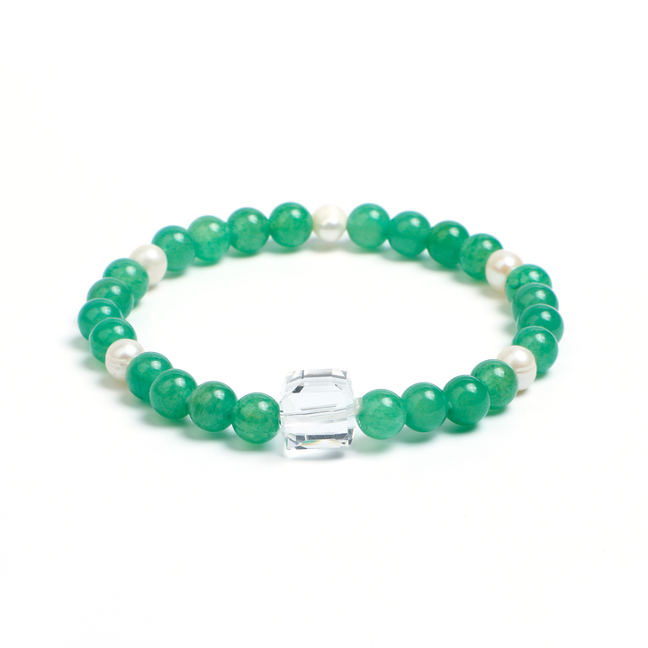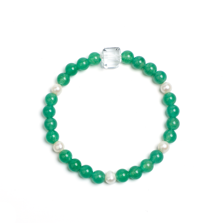 We have reimagined the traditional jade bracelet, featuring clear rock crystal as the primary stone, alternating with smooth jade beads and natural freshwater pearls. The rock crystal shines like morning dew, the jade maintains its original polished form, and the pearls glow with soft iridescence - these three materials create beautiful textural layers in light and shadow.