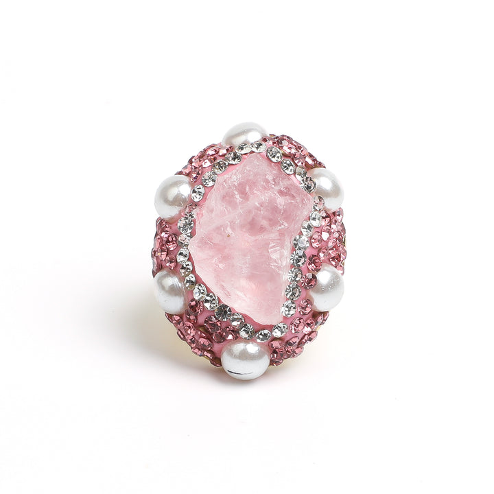 An Asian artist's celestial inspiration finds delicate expression through master artisans' meticulous craftsmanship, embodying ARTLUMINNA's philosophy of uniting organic beauty with ethereal elegance. This enchanting ring features a raw Madagascan rose quartz centerpiece preserved in its natural crystalline formation, showcasing the stone's translucent texture and soft pink hue. The irregular crystal is thoughtfully complemented by lustrous Japanese pearls and pink-hued crystals that resemble stardust scattered around moonlight. Senior artisans employed specialized stone-setting techniques to maintain the raw quartz's authentic character while creating a harmonious balance between organic forms and refined details. The rose quartz is traditionally considered to carry gentle loving energy, while the pearl and crystal accents symbolize wisdom and celestial connection. Worn as a tribute to lunar beauty, this ring infuses daily styling with poetic intelligence and subtle grace, accompanying the wearer in embracing both earthly tenderness and cosmic inspiration. The exclusive creation carries identification AL-RG-002.