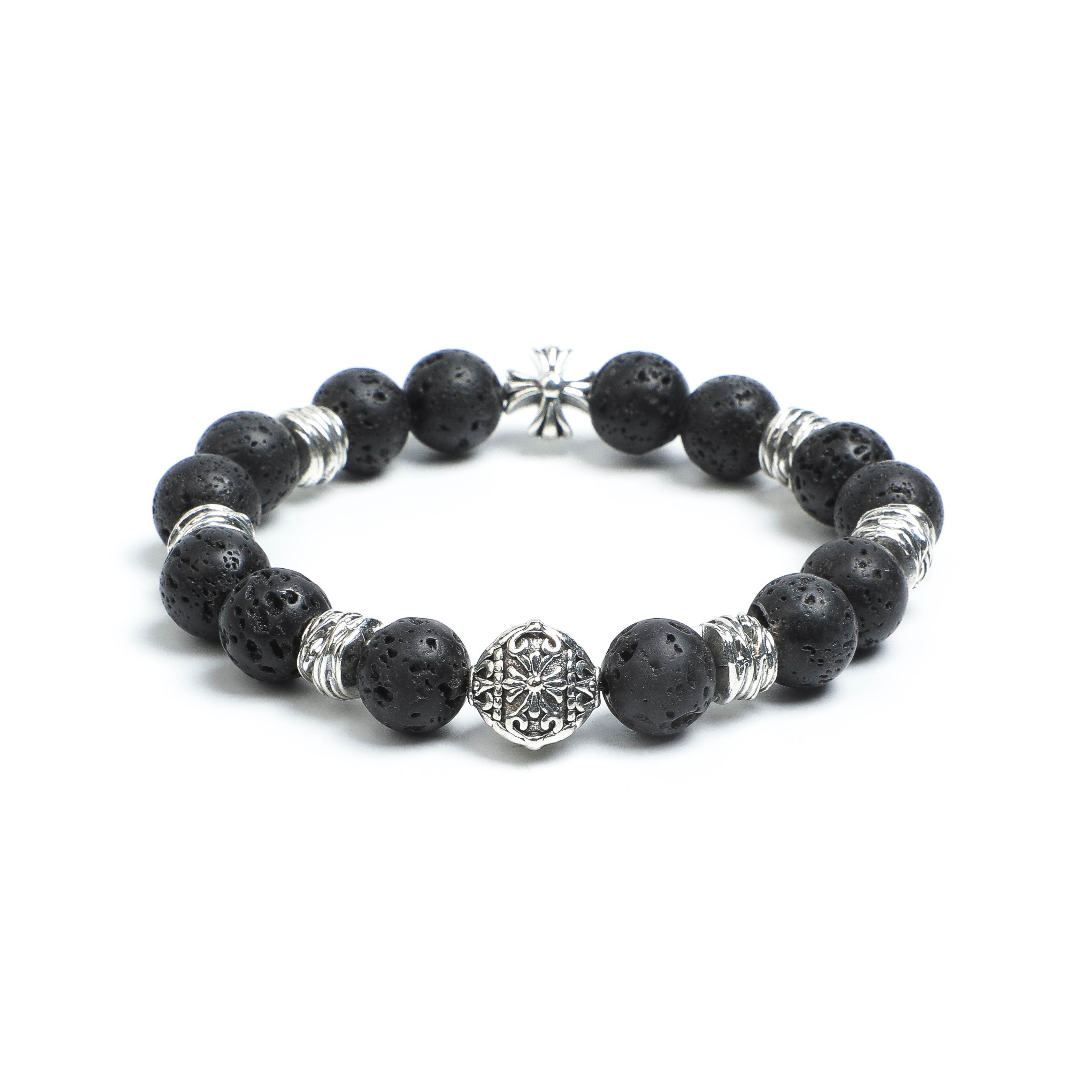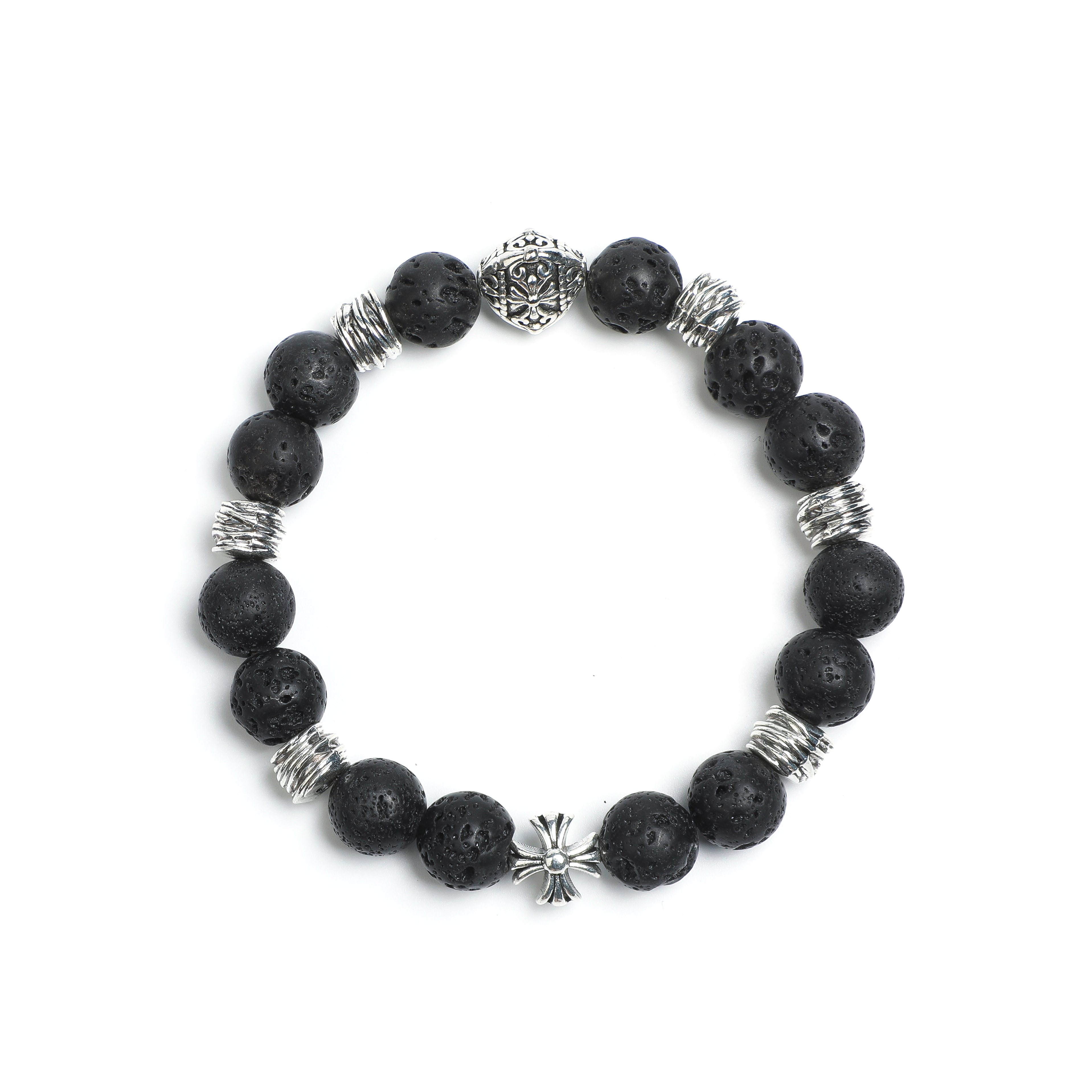 Crafted by skilled artisans, this men's bracelet features natural volcanic stone beads meticulously selected and polished to perfection. Each stone showcases a distinctive porous texture in a spectrum ranging from charcoal grey to onyx black, offering tactile warmth and exceptional lightweight comfort for extended wear.