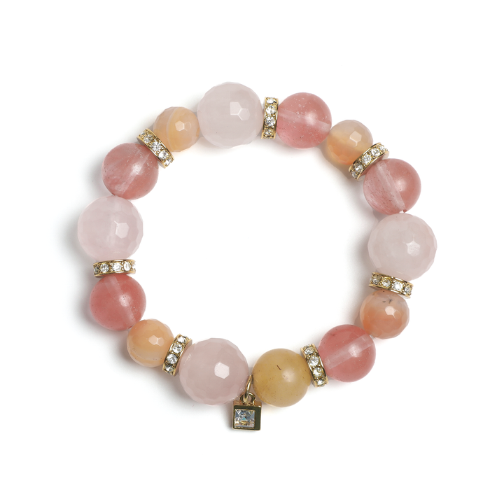 This piece features beads in soft hues of pink, light pink, and pale yellow, paired with diamond-studded metal accents. The colors blend seamlessly, radiating a brilliant luster. Its elegant and luxurious design exudes a gentle yet sophisticated style, making it suitable for various occasions to showcase feminine grace.
