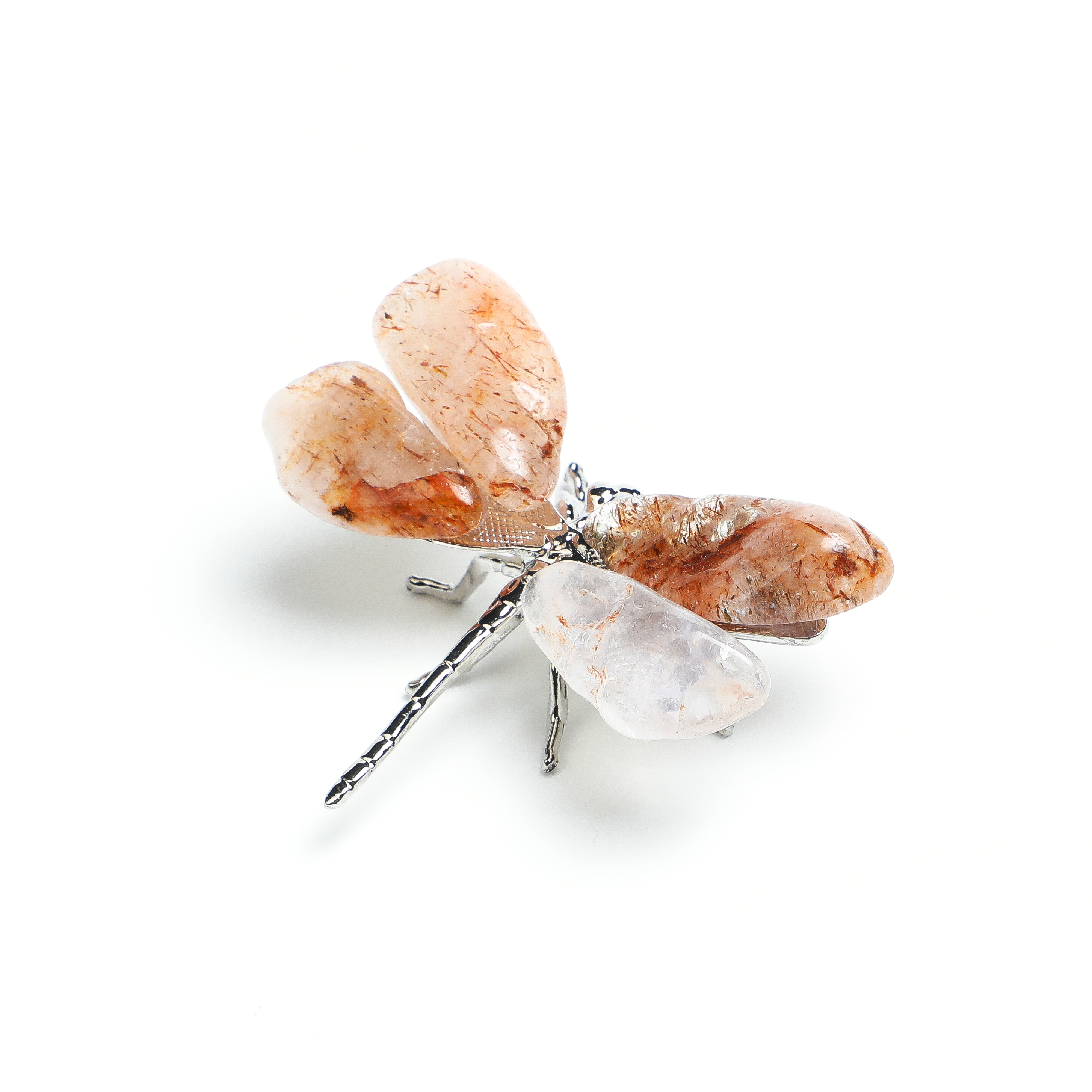 This unique piece uses natural slices of Mozambican red phantom quartz for the dragonfly's wings. Each wing preserves original crystal contours and internal phantoms, displaying uncut natural formations. The body utilizes material from the same cluster, set on a raw bedrock base. Red inclusions naturally distribute within the wings, creating distinctive artistic effects. In mineral art领域, such works emphasize respect and presentation of natural forms. Suitable for art galleries and private collections, it showcases the raw beauty of natural minerals.