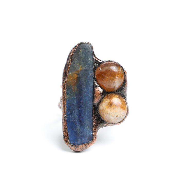 ARTLUMINNA presents the Time Imprint Ring, featuring golden-colored mineral from Brazilian mines and Mongolian sodalite in a harmonious union that echoes the Earth's ancient geological narratives. The sun-kissed golden mineral gently embraces the deep blue sodalite, with each natural vein preserving memories of millennia. Meticulously hand-set using specialized techniques, this ring transforms planetary history into wearable art. Wear it during moments of decision-making, creative exploration, or personal reflection, as these minerals are traditionally believed to harmonize logic and intuition, guiding you to maintain clarity and composure throughout life's journey.