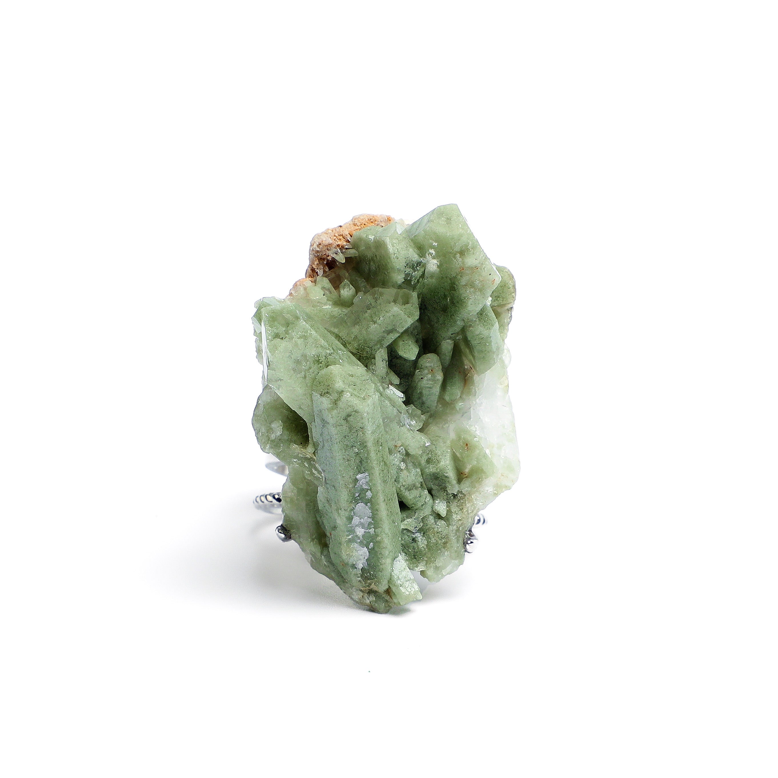 This exceptional piece showcases a Green Phantom Quartz from Brazil's Minas Gerais region, where its unique creamy texture and interlocking crystal formations create the impression of miniature mountain ranges. Each crystal peak is carefully hand-set to preserve the organic flow of the natural growth patterns, with the soft green inclusions appearing like mist weaving through ancient forests. The piece embodies the Eastern philosophical appreciation for natural harmony, where the creamy green tones evoke feelings of tranquility and balanced energy. Designed for daily contemplation, this ring serves as a portable landscape that reminds the wearer of nature's gentle yet persistent beauty. As part of ARTLUMINNA'sWorldly Wanderlust, it represents our founder's discerning selection of global minerals that carry both visual warmth and emotional resonance, transformed through artisan collaboration into a wearable piece of geological art.