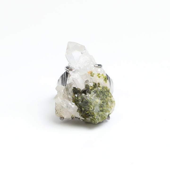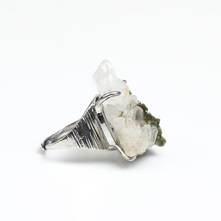 This distinctive piece features a Garden Quartz sourced from the alpine regions of Switzerland, where microscopic white crystal columns emerge from a bed of green chlorite inclusions, creating a miniature landscape of extraordinary detail. Each crystal formation is preserved in its natural state through careful hand-setting, allowing the delicate interplay of transparent quartz and snowy formations to evoke the image of sunlight filtering through a forest canopy. The piece embodies a natural aesthetic that finds beauty in organic forms and the passage of time, where the white crystals symbolize purity and clarity while the green base represents growth and renewal. Designed for daily wear, this ring serves as a gentle reminder of nature's intricate beauty and the quiet wisdom it imparts. As part of ARTLUMINNA'sWorldly Wanderlust, it reflects our founder's dedicated curation of globally sourced minerals that tell silent stories of geological wonder, transformed through artisan collaboration into wearable poetry.