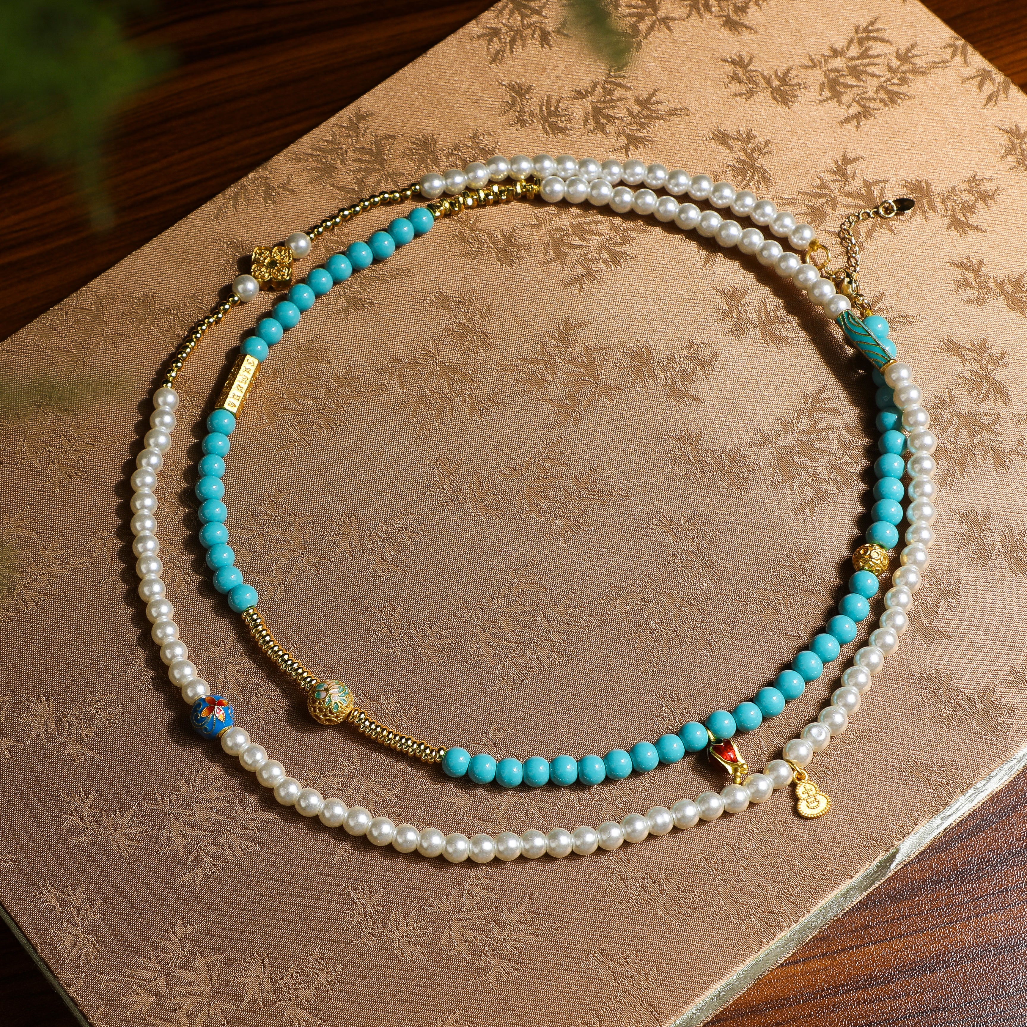 Natural turquoise and freshwater pearls intertwine in this double-layer design, accented with handcrafted enamel beads. Turquoise displays unique spiderweb patterns in sky-blue hues, pearls offer a soft glow, while enamel beads echo Eastern aesthetics in blue-and-white tones. Each layer is carefully balanced to be worn separately or together for versatile styling.