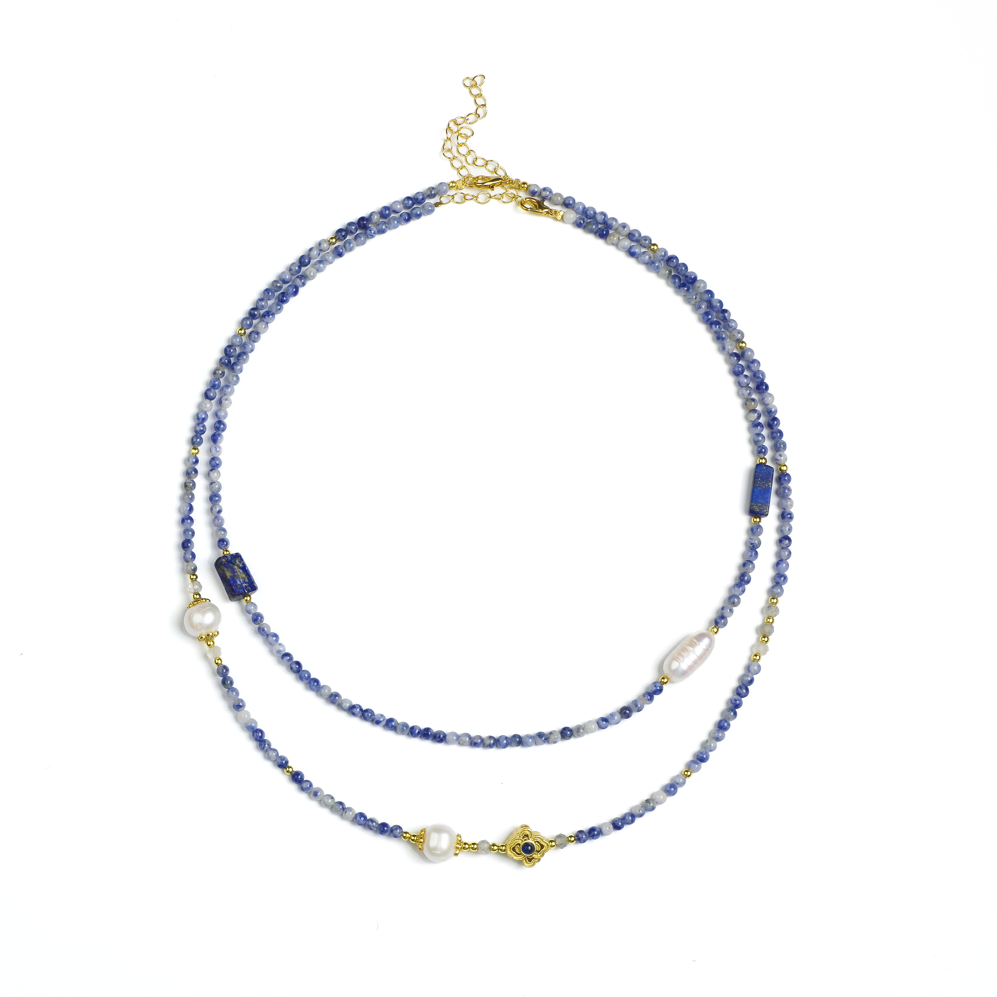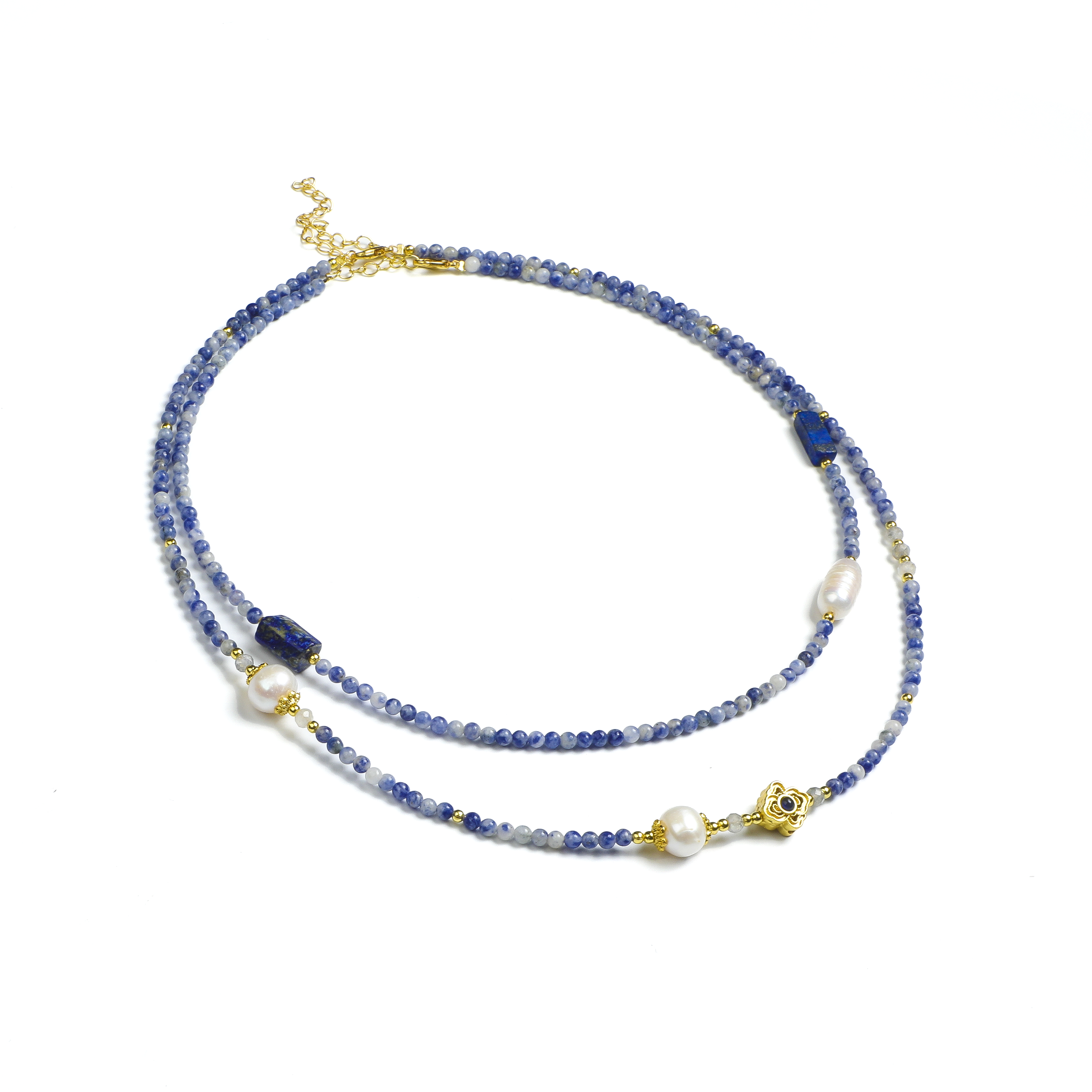 This Zen Collection piece brings together the deep blue of lapis lazuli, the subtle tones of gray agate, and the soft luster of cultured pearls. The lapis lazuli displays characteristic golden pyrite inclusions, while the gray agate shows gentle banding patterns. Pearls provide organic texture to the composition. In Eastern traditions, lapis lazuli is often associated with inner wisdom, gray agate with emotional balance, and pearls with purity. These elements create a sophisticated color story that transitions from celestial blue to earthy gray. The piece works well with both casual and formal attire, offering versatile styling possibilities. As a unique arrangement in our collection, it reflects the Zen appreciation for mineral diversity and harmonious contrast.